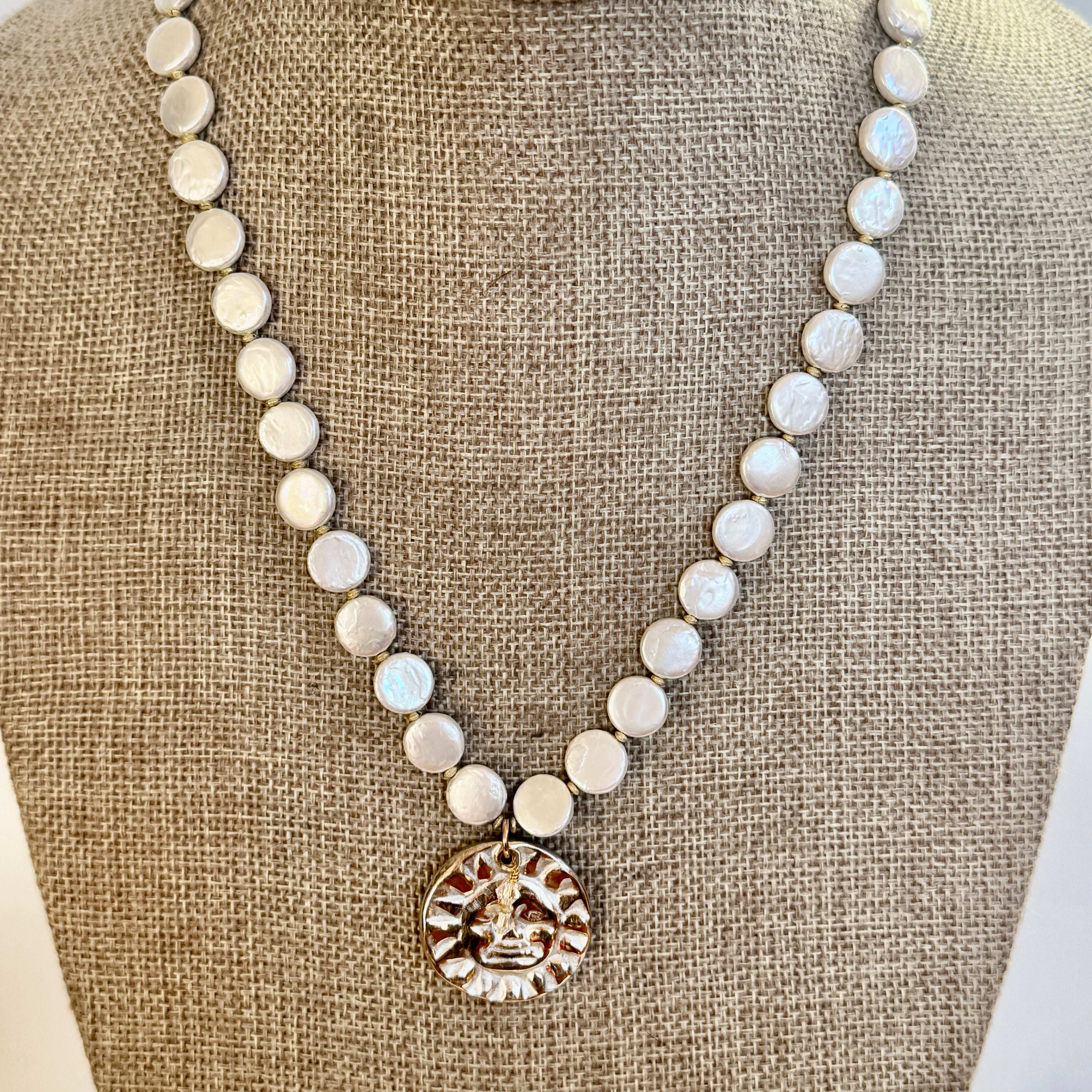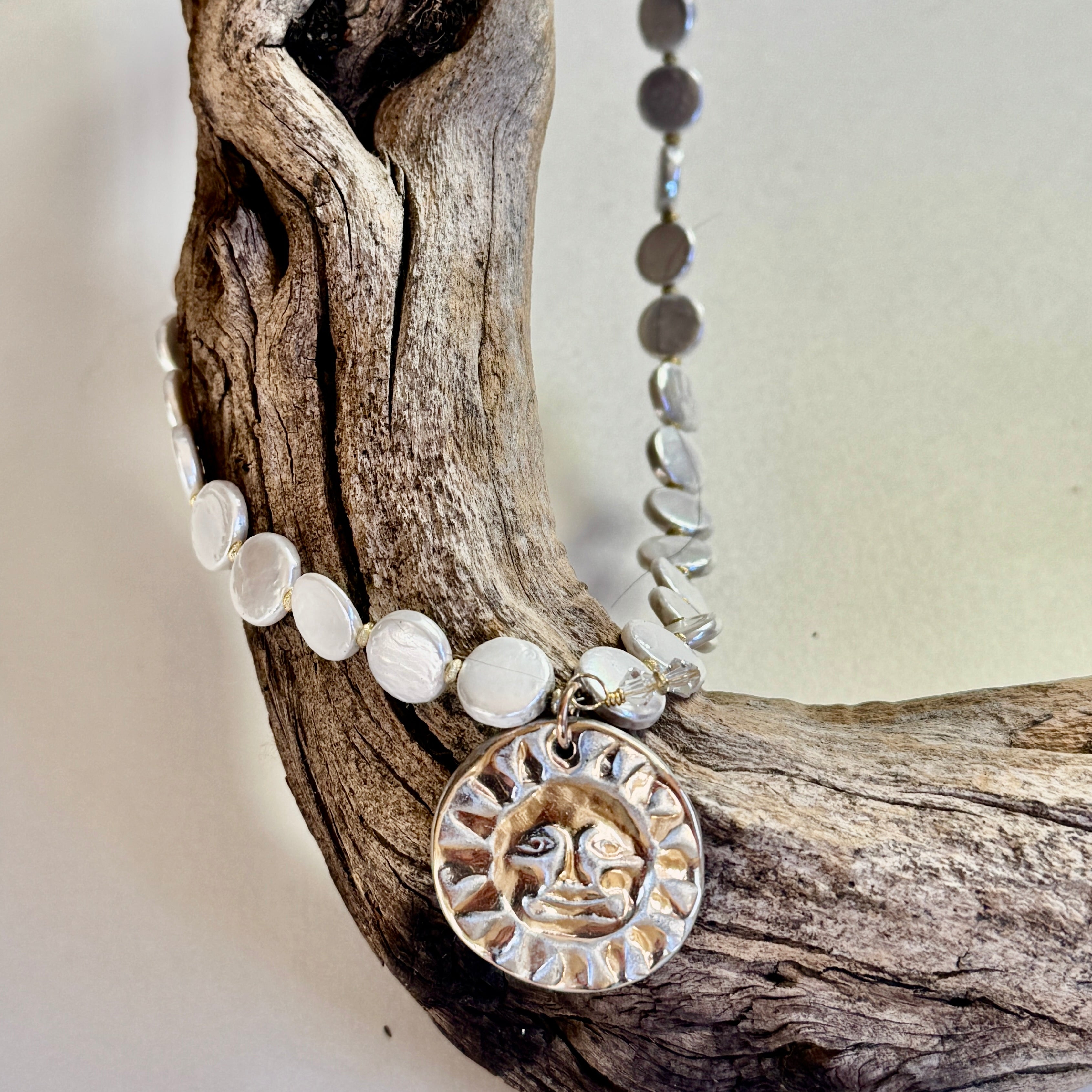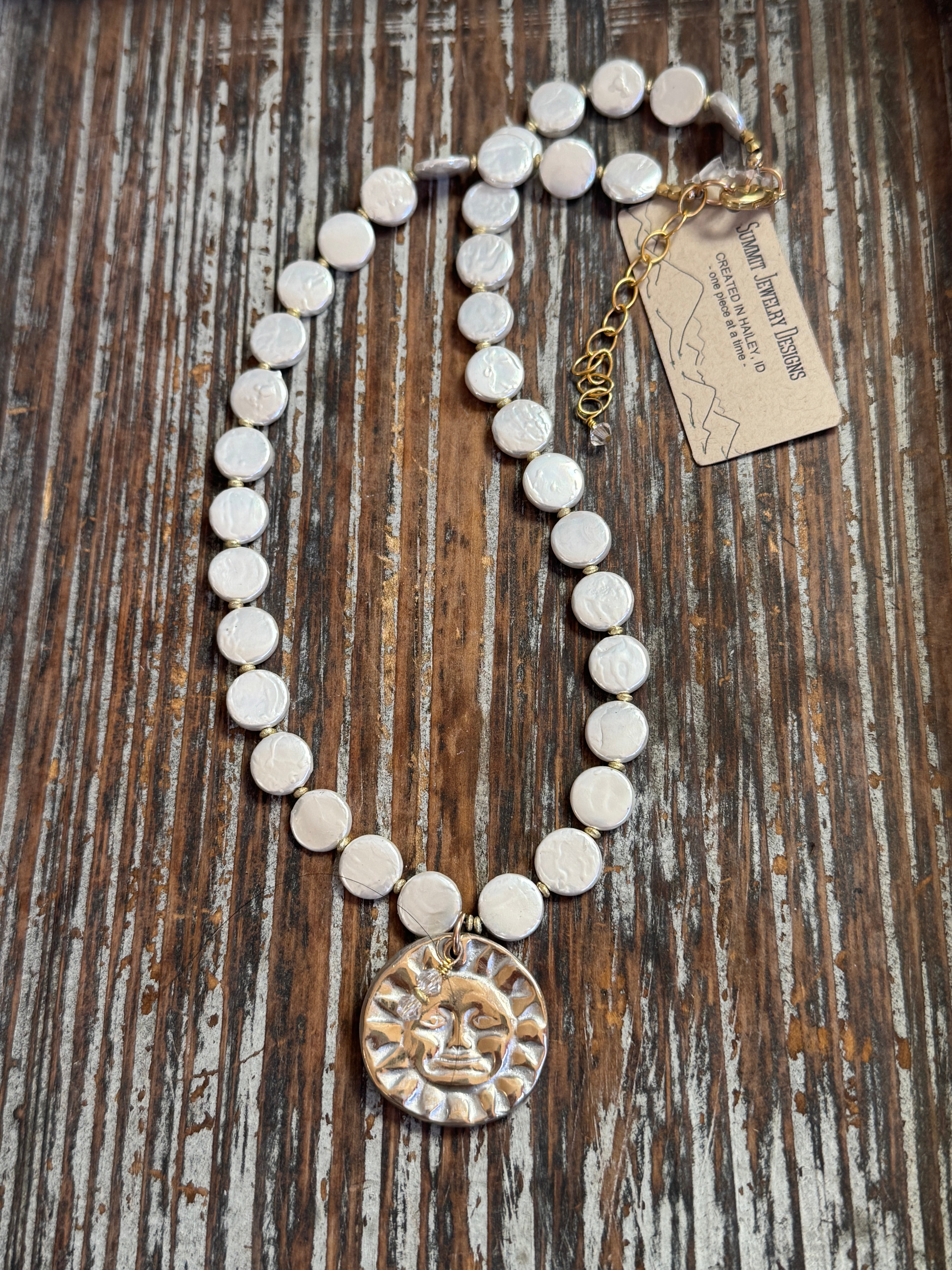 Two-Sided Mountain/Sun Pendant On Peacock Seed Pearls